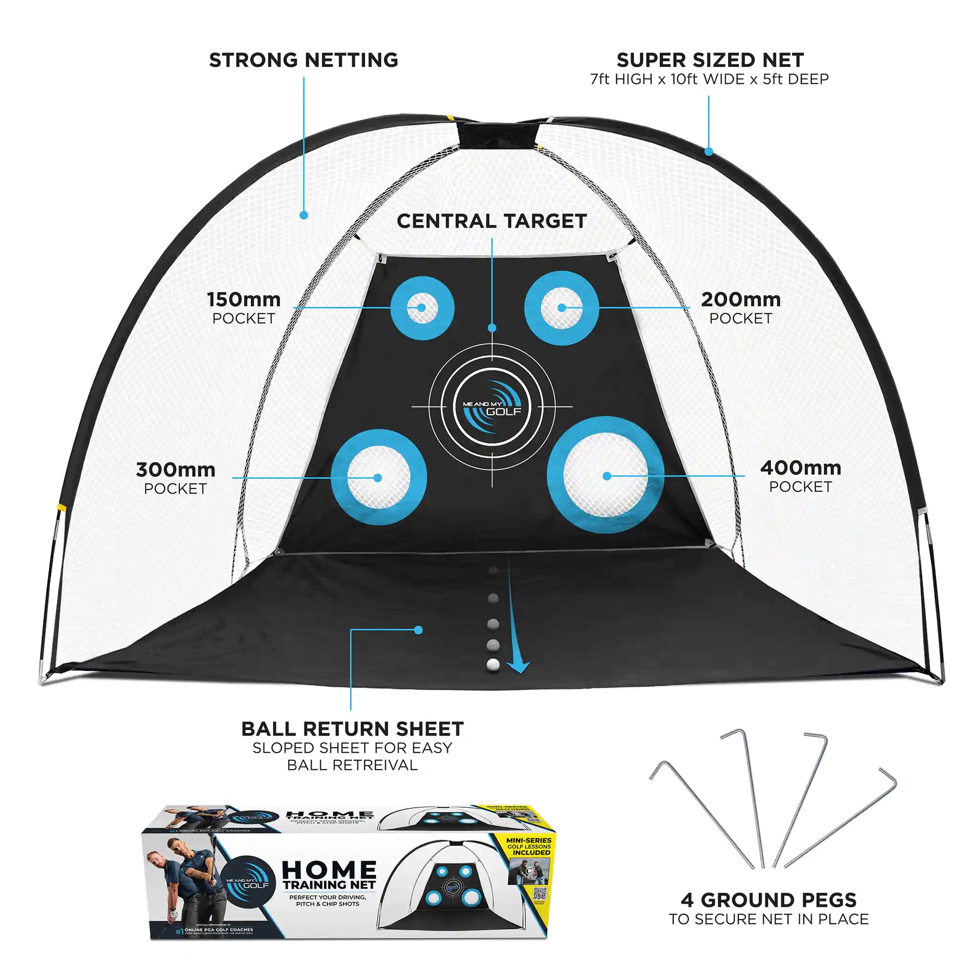 - Super sized golf net 7 feet high, 10 feet wide & 5 feet deep